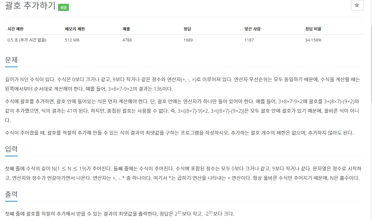 이번 문제는 수 사이에 괄호를 적절히 추가하여 식의 결과 값을 최대로 만드는 것이다.